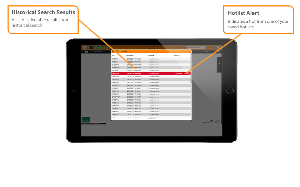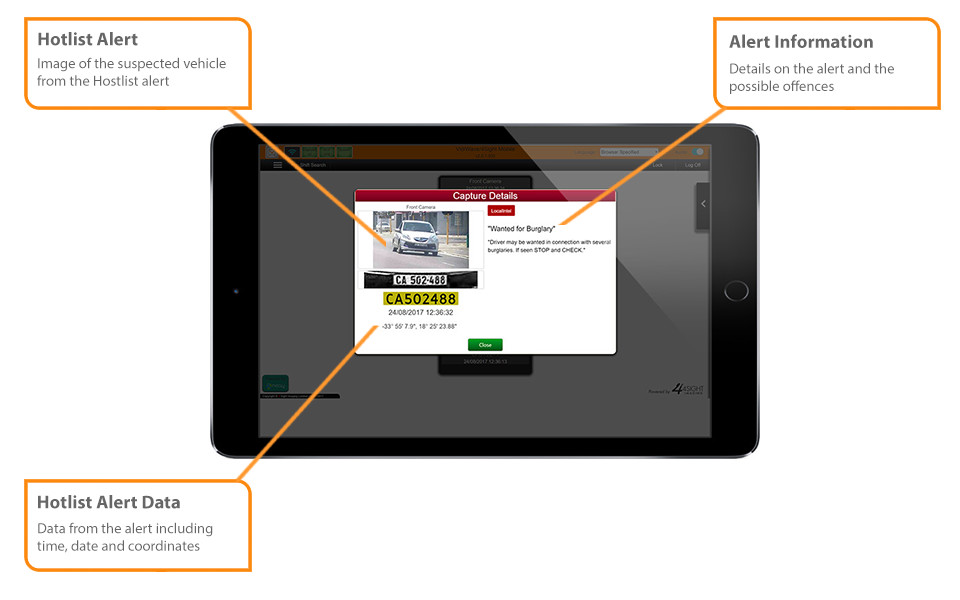When the system has a positive ID from a hotlist – it flags the offending vehicle to the police officer with an on-screen message, which details the offence and/or crime that the vehicle or the owner is linked with and a suggested response.